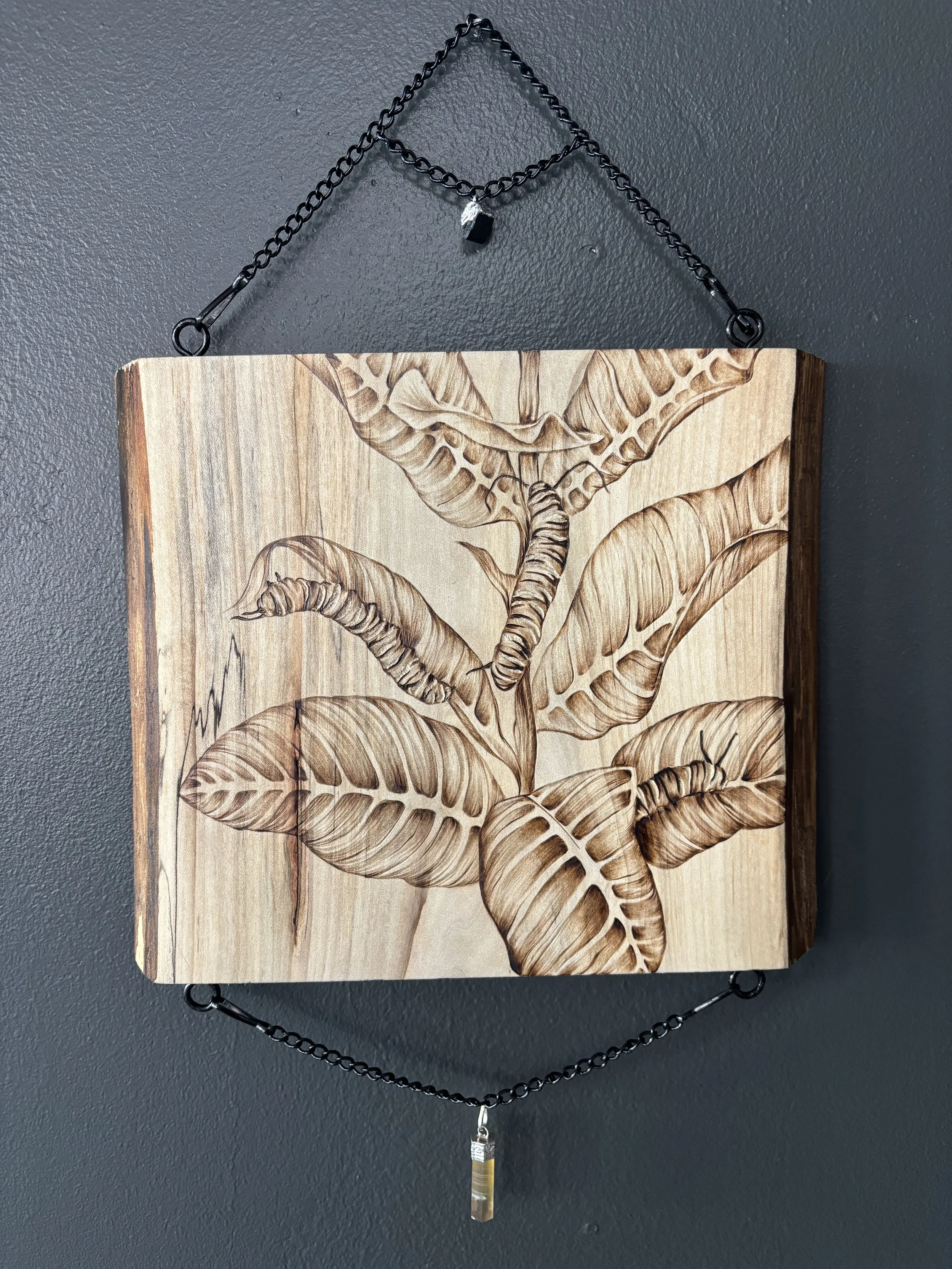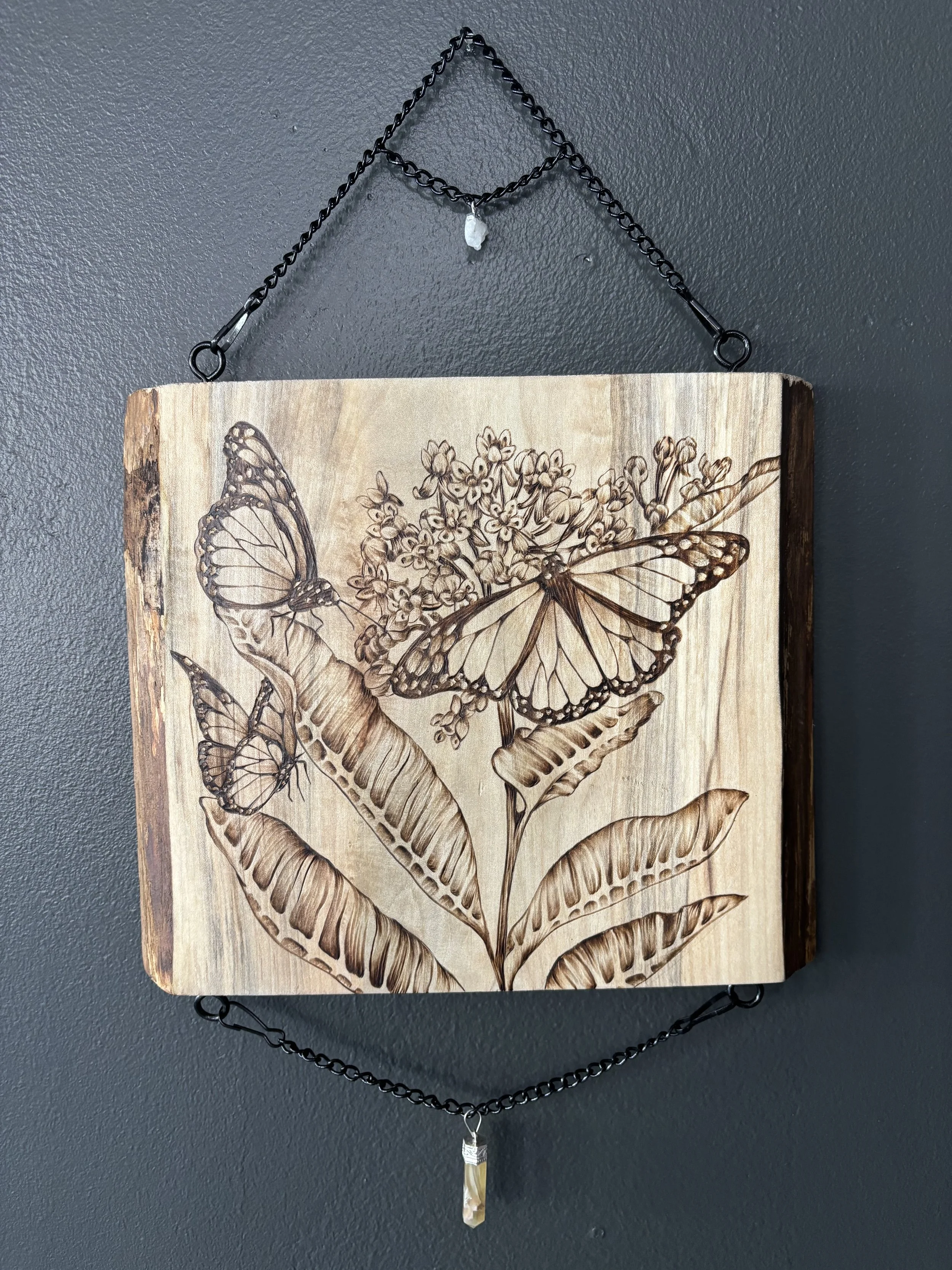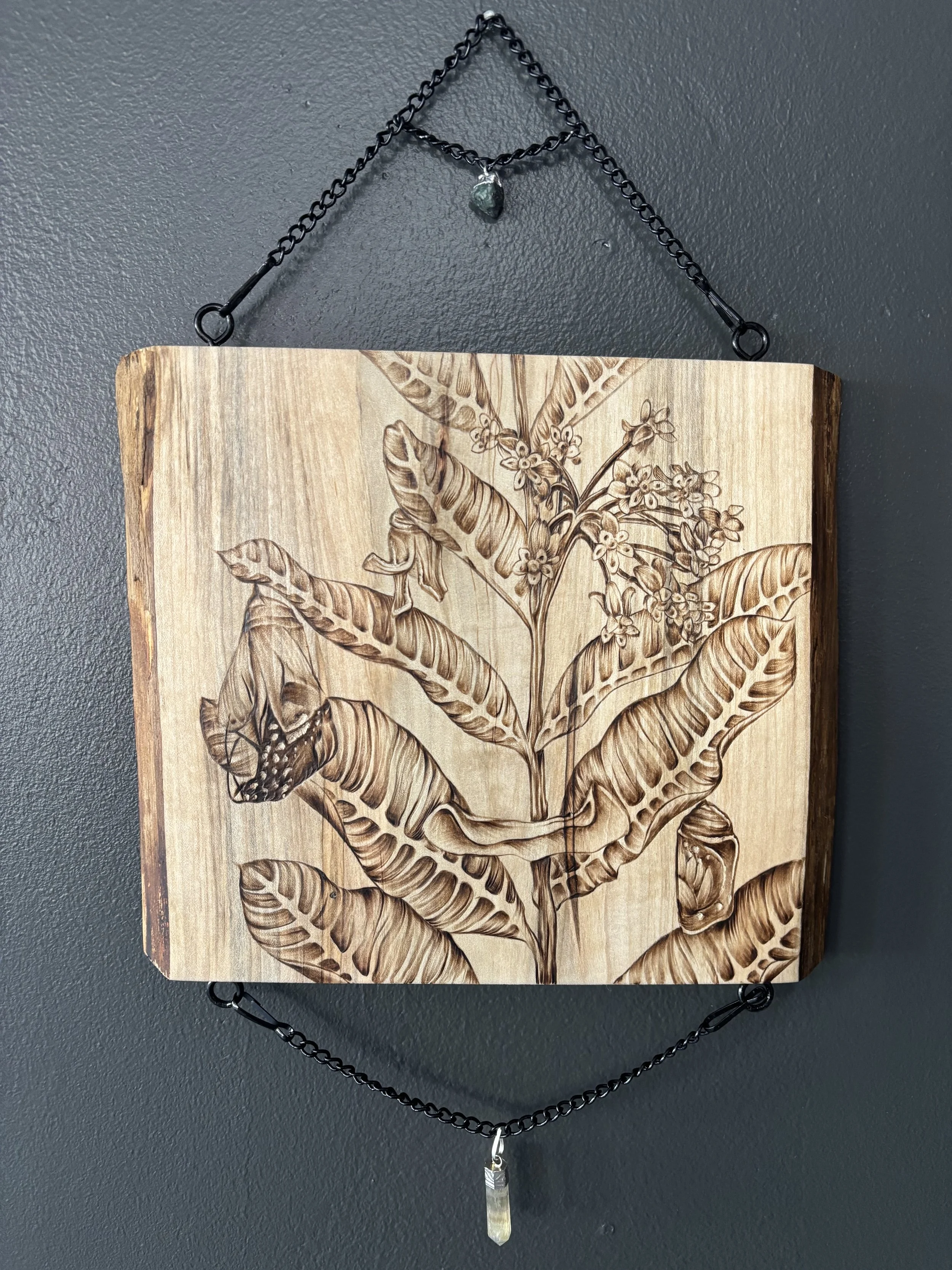 Series of three Woodburnings on live edge ambrosia maple. These pieces depict the lifecycle of monarch butterflies through a continuous milkweed plant. These three pieces come from the same live edge board, so both the design and wood grain are continuous throughout.